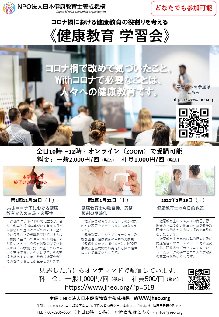 皆様の毎回の1つのアクションが、本機構の認知、同じ思いを持つ仲間との出会い、そして健康教育士同士のコミュニティの拡大につながっていきます。皆様の持つSNSや独自のネットワーク展開範囲で結構ですので、ご周知いただければ幸いです。
